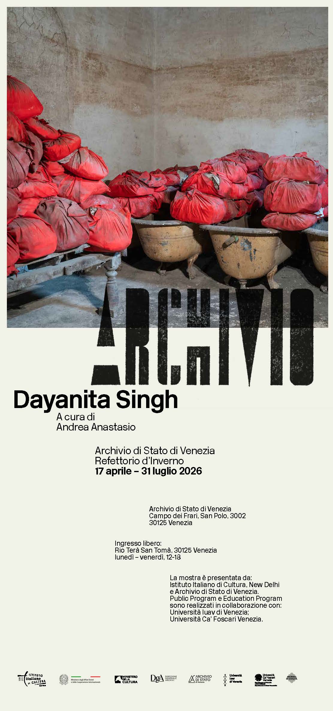 Per la prima volta nella sua storia, l’Archivio di Stato di Venezia apre al pubblico come sede espositiva, ospitando la mostra fotografica Dayanita Singh. Archivio. La mostra, inaugurata il 16 aprile, sarà visitabile fino al 31 luglio 2026. Giorni e orari di apertura: dal lunedì al venerdì, dalle 12:00 alle 18:00. Ingresso libero (da Rio Terà San Tomà).